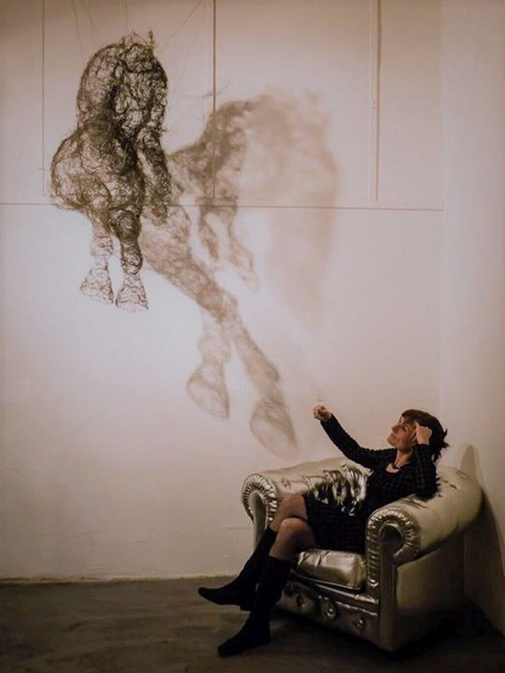 Aus Draht schafft sie Skulpturen, die sich durch Licht, Luft und Raum ständig verwandeln und deren Schatten neue Abbilder auf Wand und Hintergrund entstehen lassen. So schafft sie Kunst in vier Dimensionen. Ausdruck und Stimmung können eingefangen werden. Sind es Schatten, die die Skulpturen an die Wand werfen, oder sind es Zeichnungen?