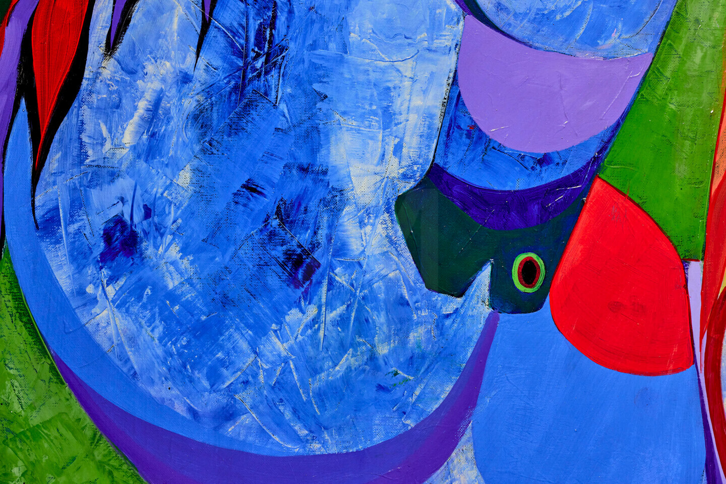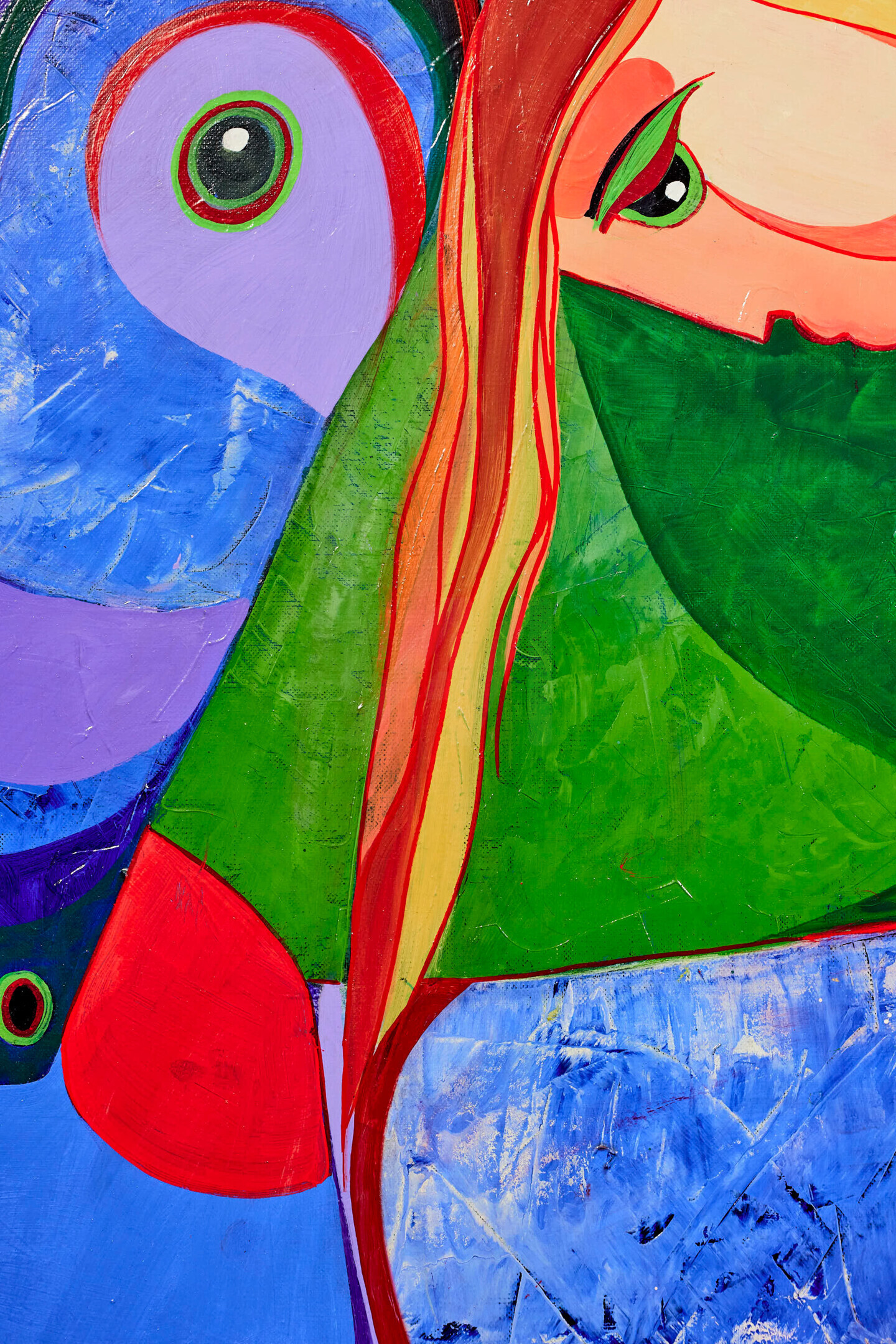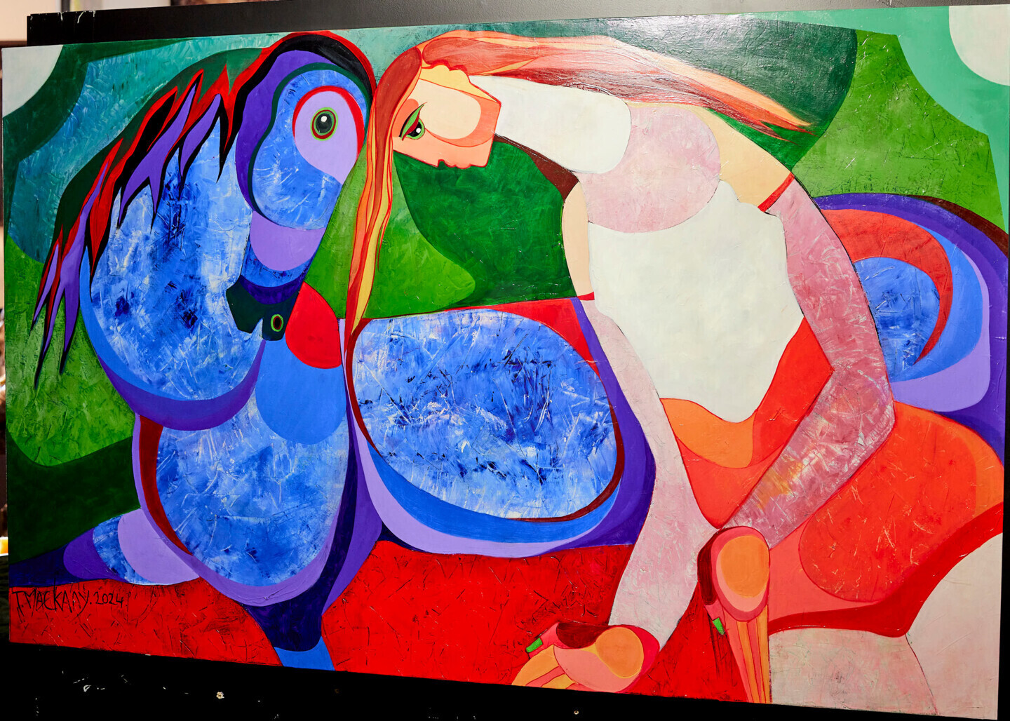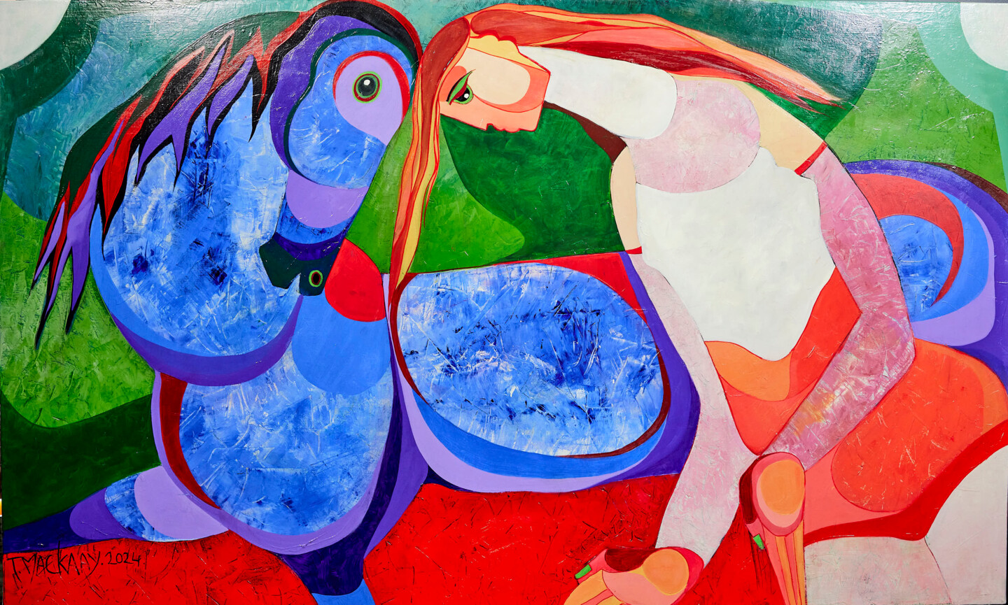 Beside the magnificent steed stands the woman, a figure of quiet confidence and serenity. Wrapped in the artist’s vibrant hues, she exudes a magnetic charm, her presence commanding attention without effort. In her gaze lies a tender reverence for the equine spirit, a bond forged through mutual respect and understanding.