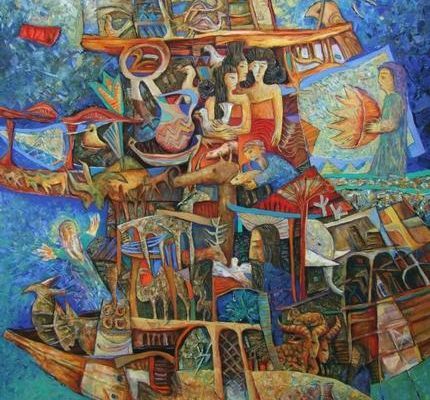 with a lot of Bulgarian spirit. He is looking after tradition, but its inspiration makes him a genuine artist with a dinstinctive personality and sound imagery. Strong talent rethink church iconography and his paintings reveal the fantastic world of
