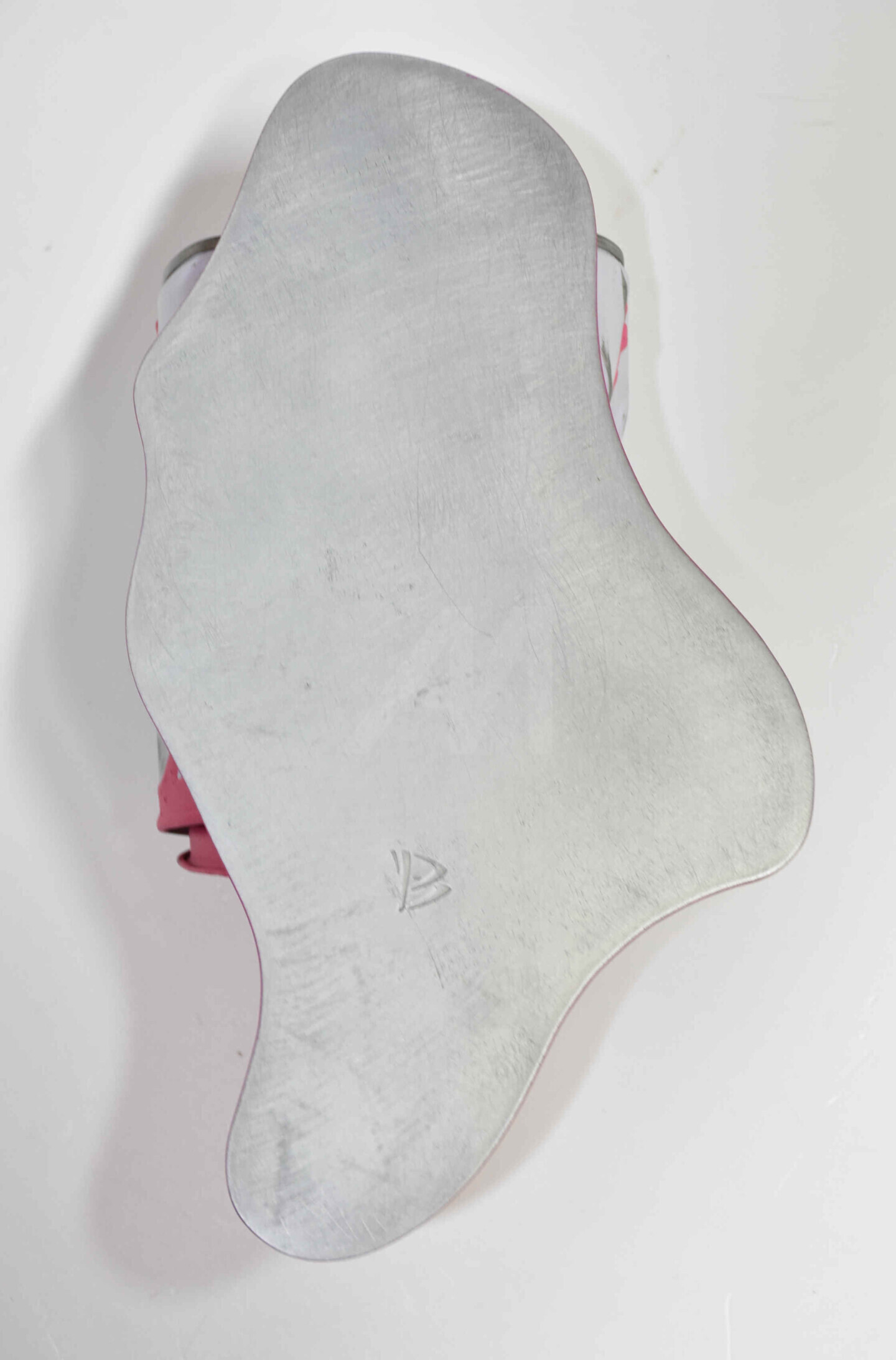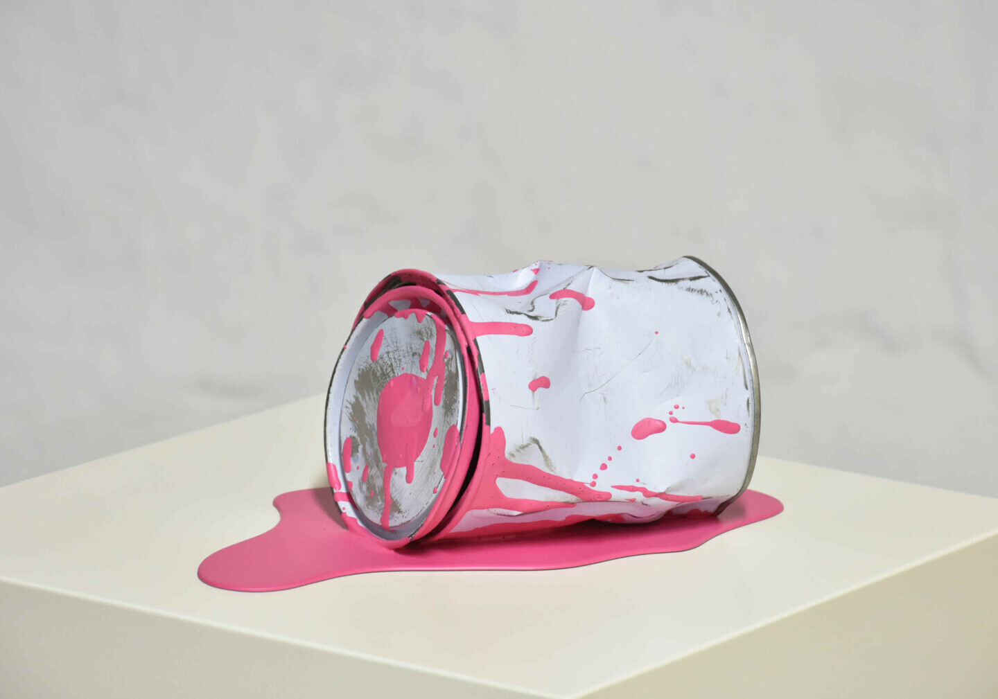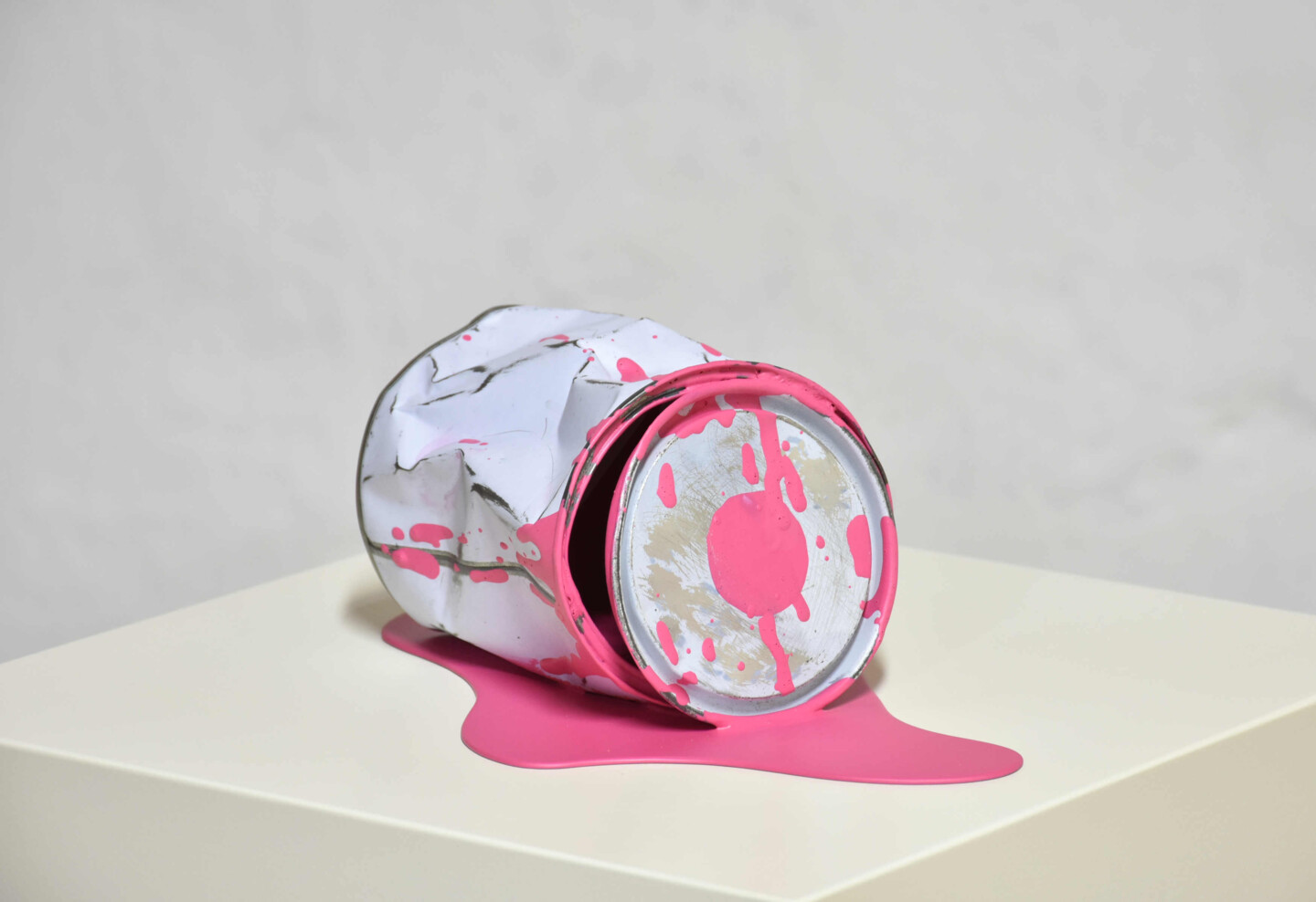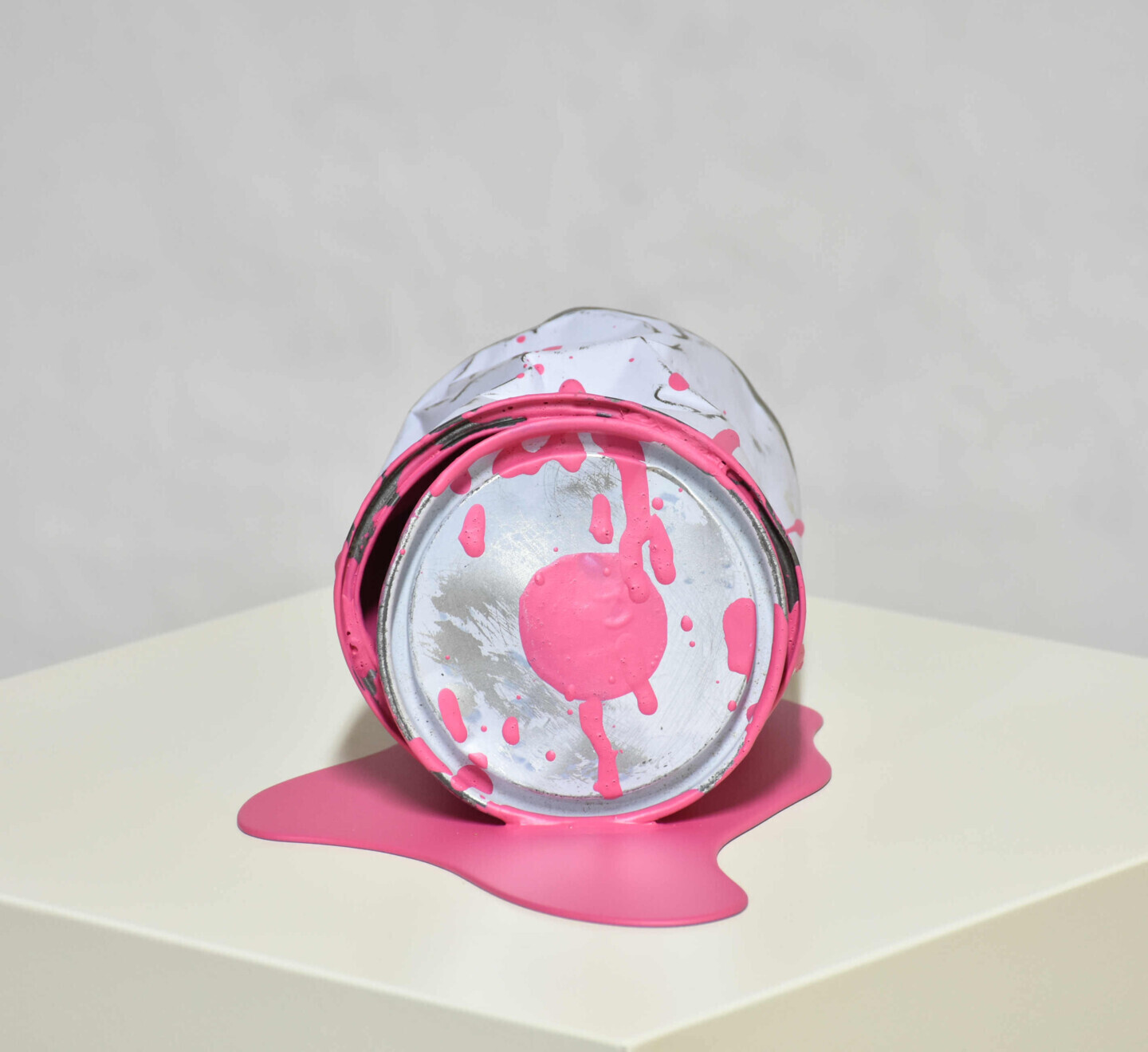 Le contraste entre la surface métallique froissée et la vivacité du rose crée une dynamique visuelle intrigante. Le débordement de peinture forme une flaque naturelle sur le socle, évoquant à la fois chaos et fluidité. La texture réaliste de la boîte accentue l’illusion de spontanéité et de mouvement. Le choix du rose, couleur associée à la créativité et à l’émotion, invite à une interprétation personnelle de l’œuvre, interrogeant la relation entre l’art urbain et la spontanéité de l’expression artistique.