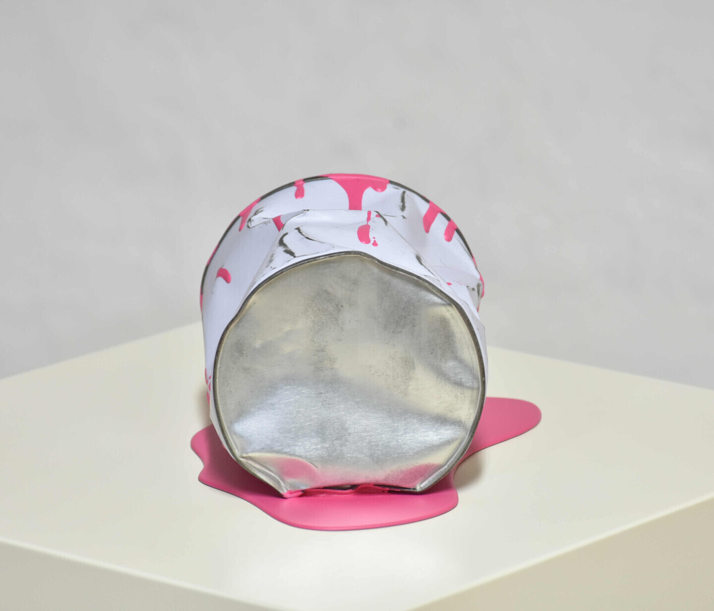 Cette œuvre représente une boîte de conserve écrasée, partiellement ouverte, d’où s’échappe une peinture rose vif.