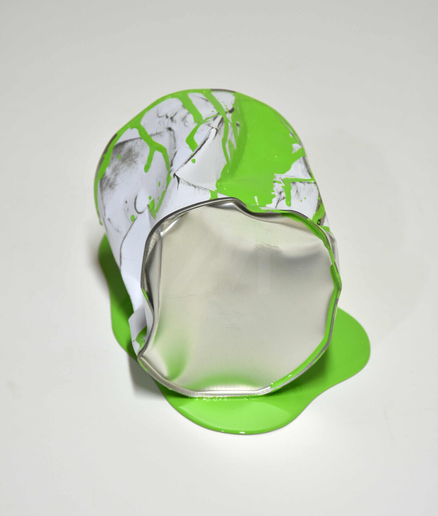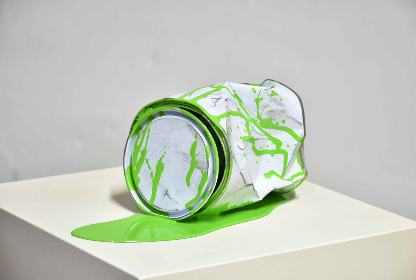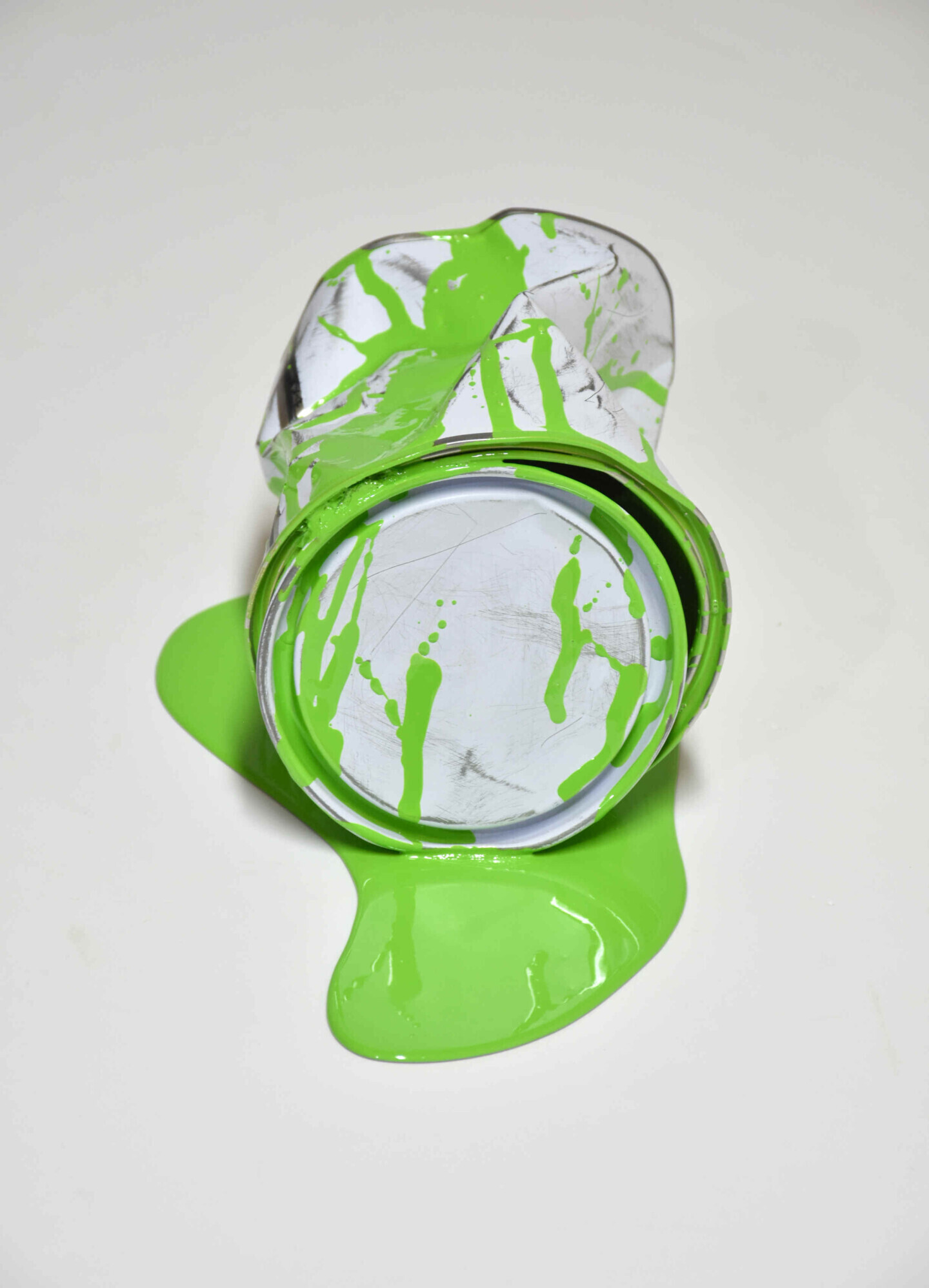 Cette œuvre présente une boîte de peinture renversée, d'où s'écoule une éclatante peinture verte. La fluidité du liquide contraste avec la solidité de la boîte, créant un spectacle visuel captivant.