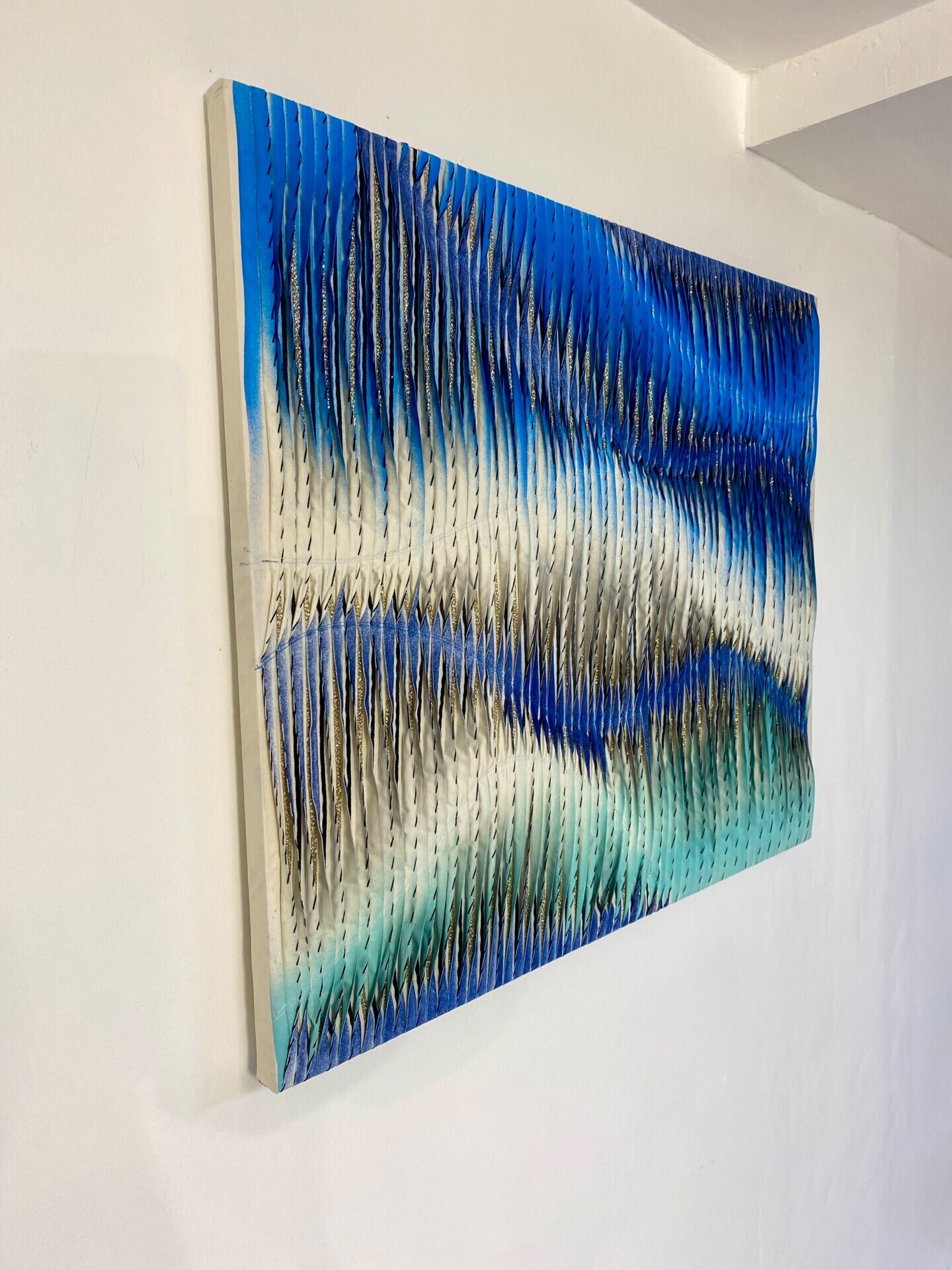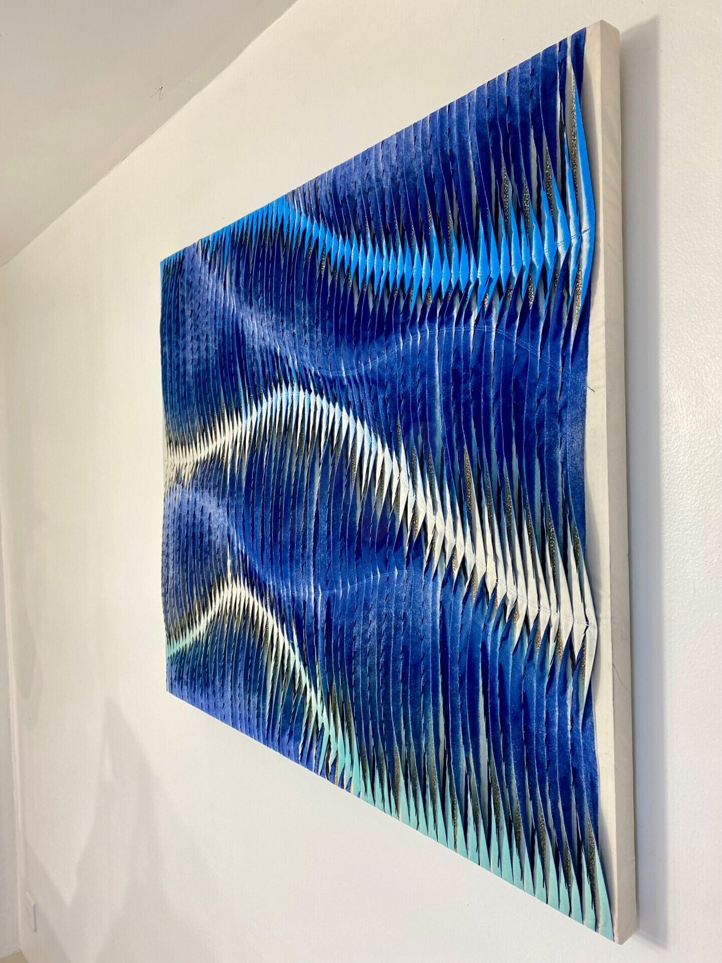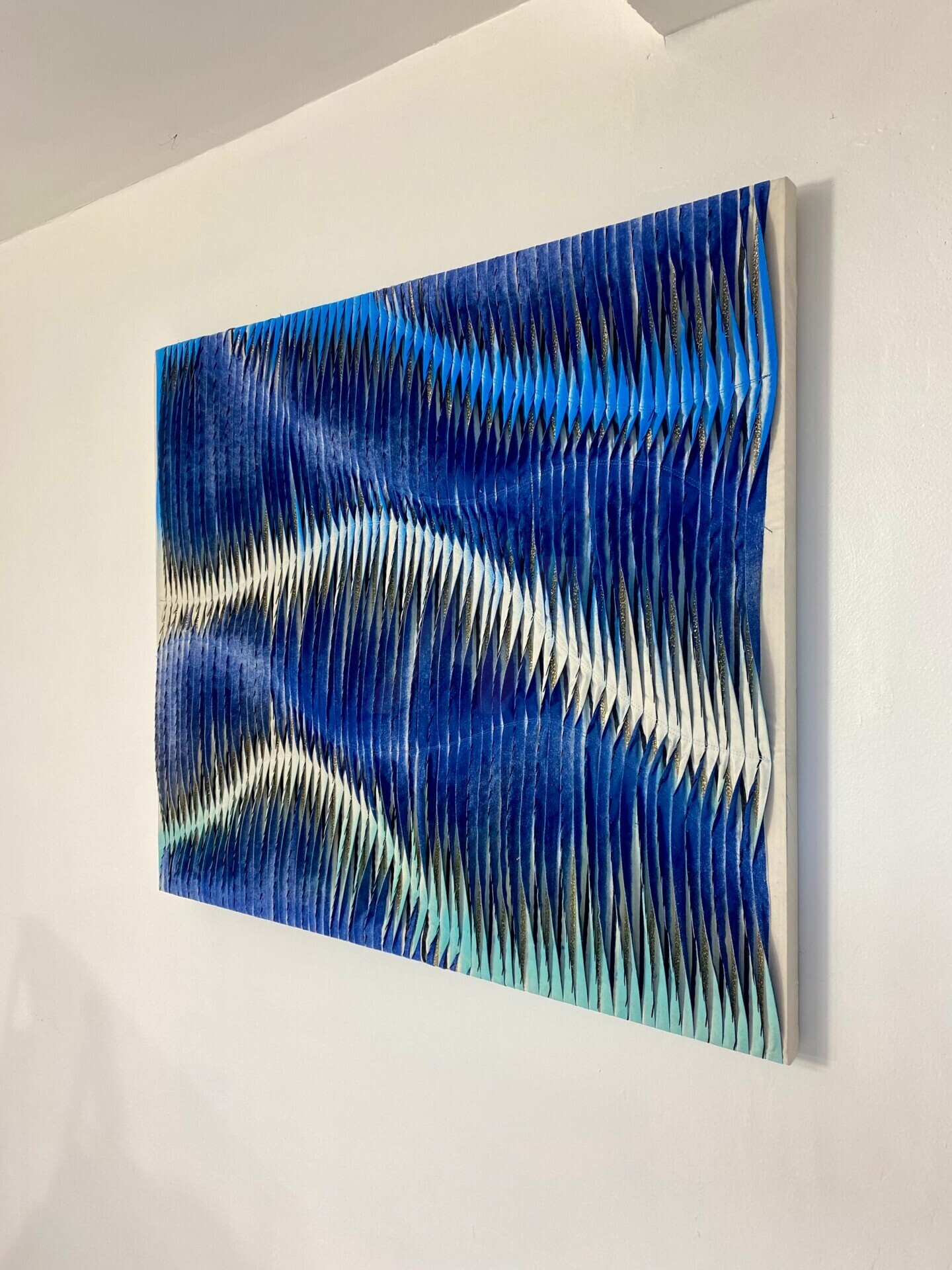 Tableau sculpture textiles effet de vague et de relief obtenu par la magie du plissage. Réf : Boréal