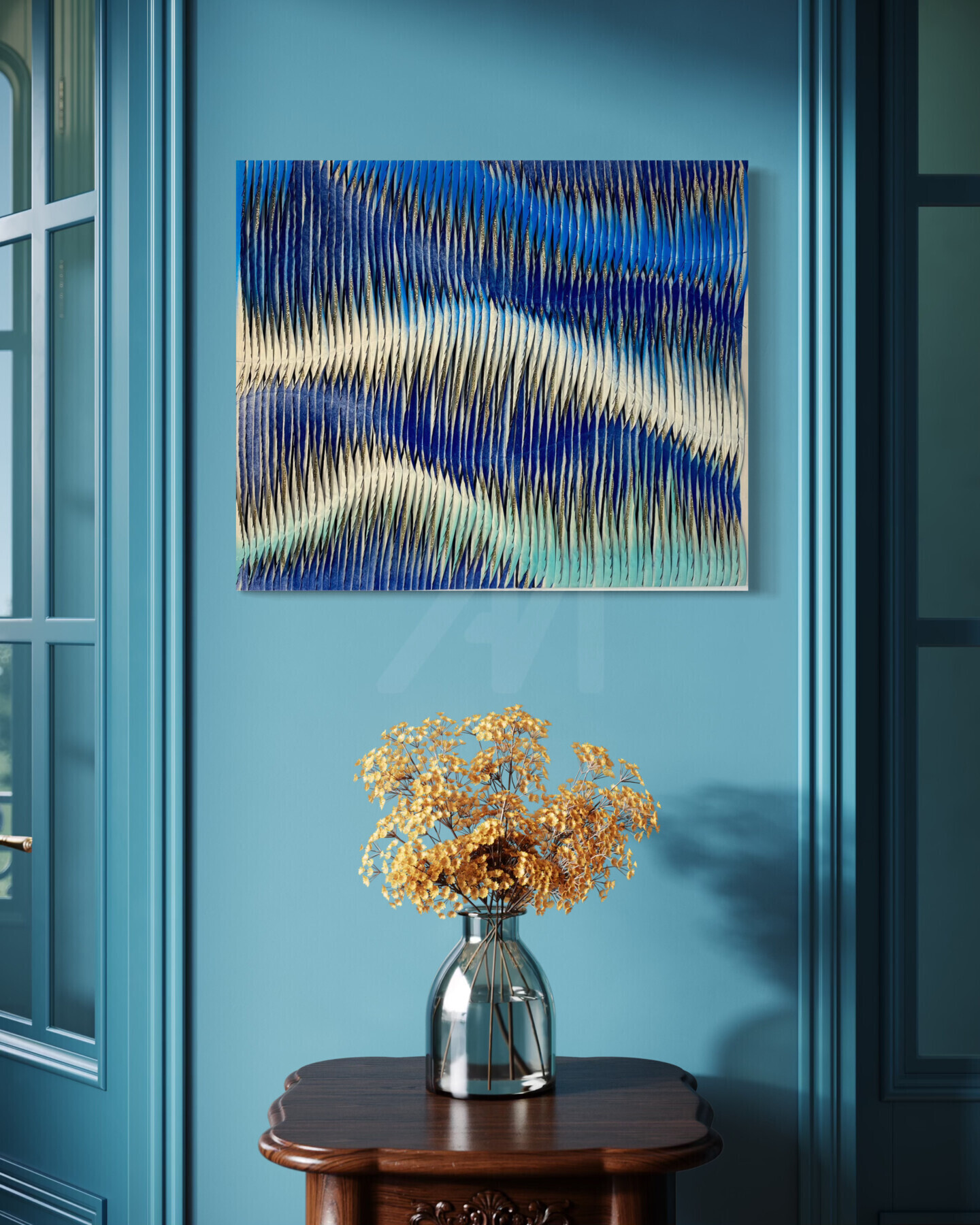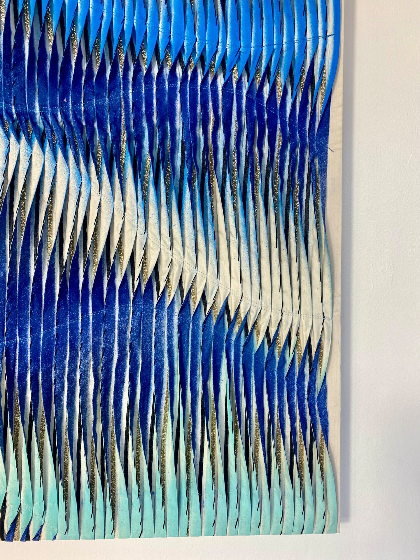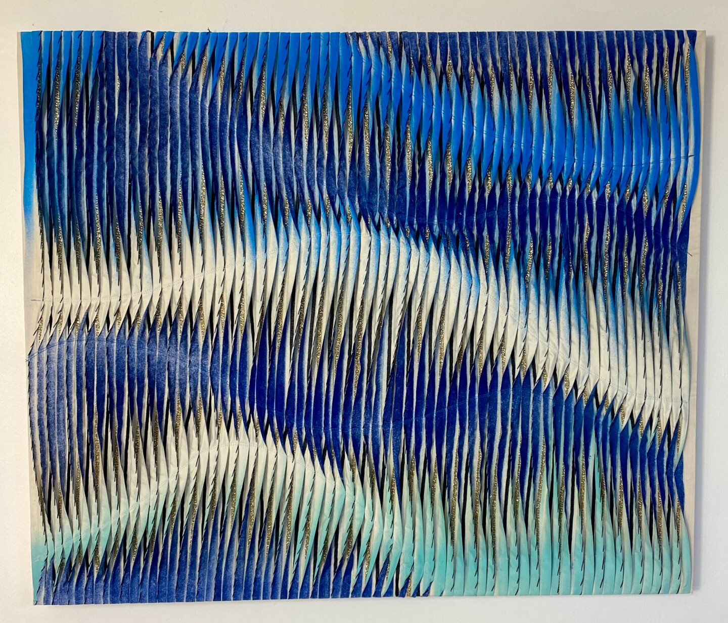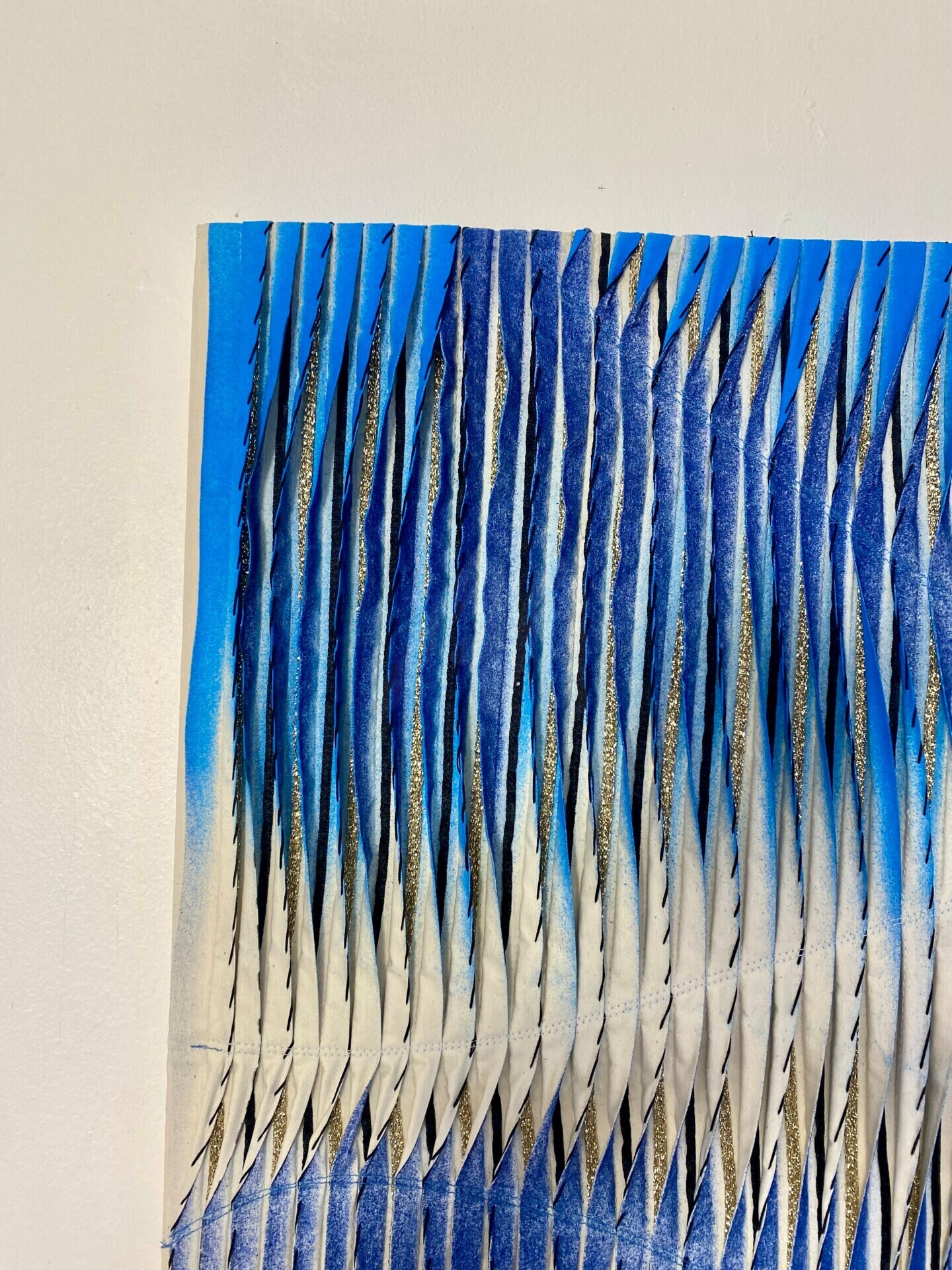 Tableau sculpture textiles effet de vague et de relief obtenu par la magie du plissage. Réf : Boréal