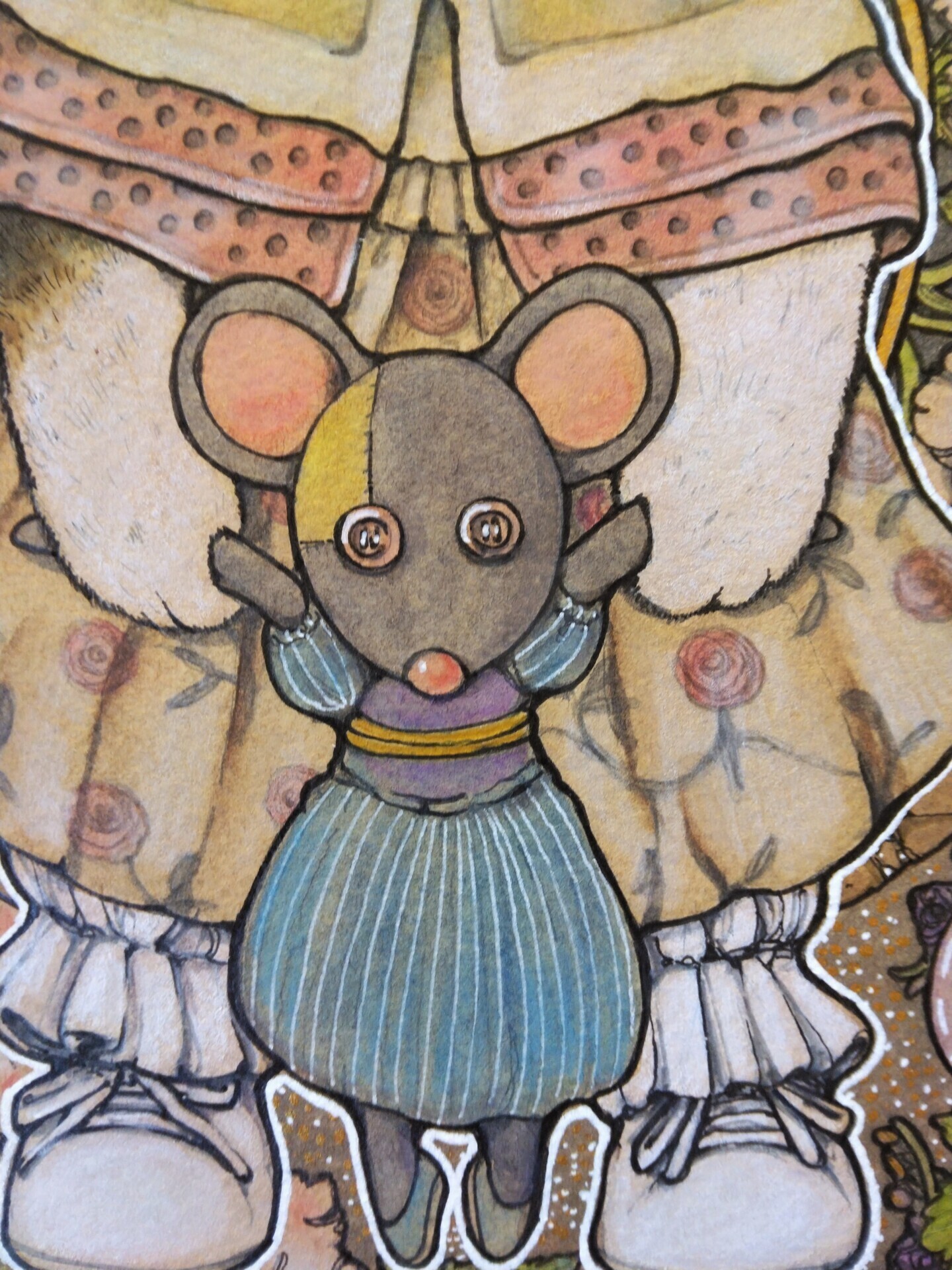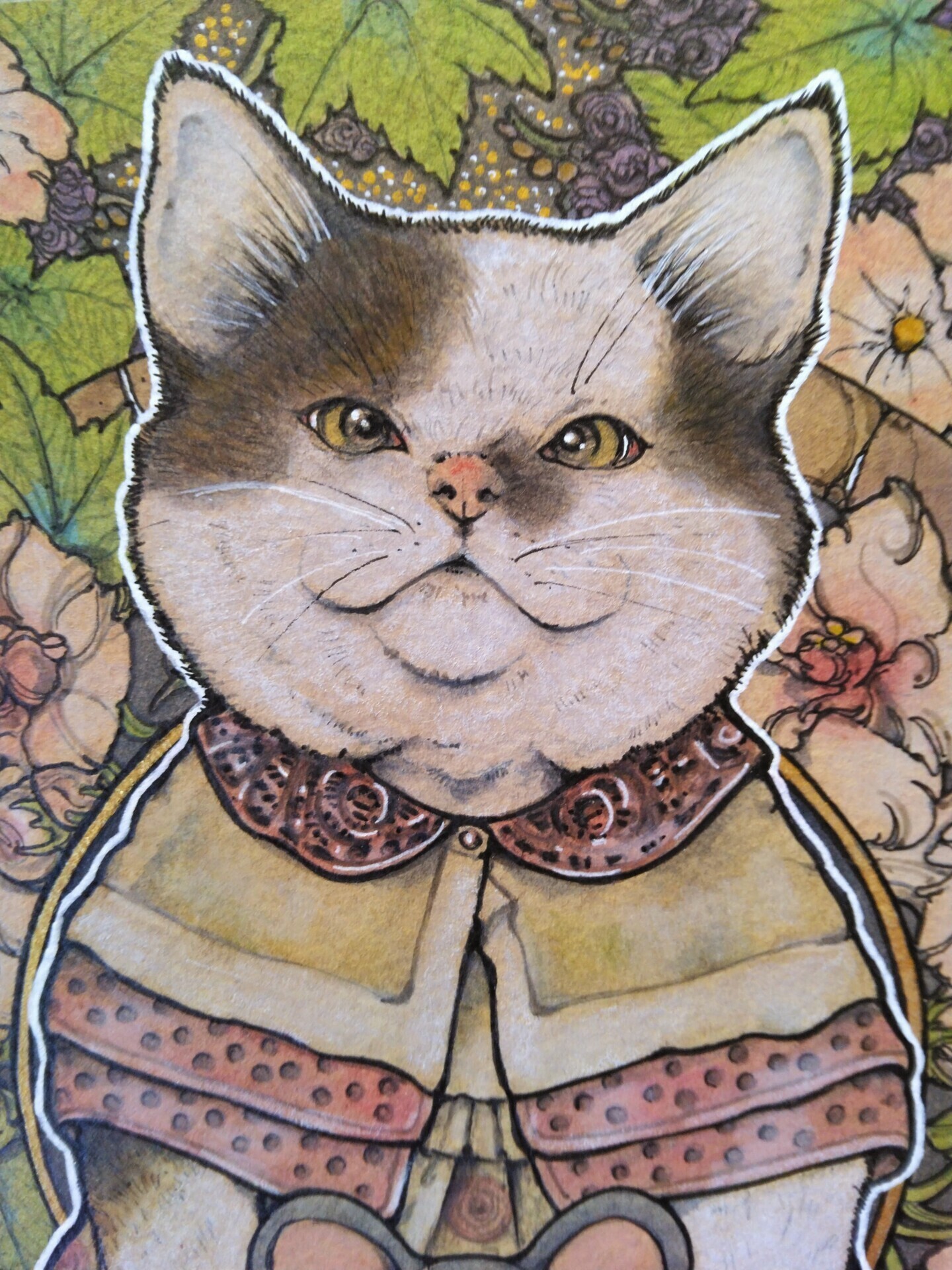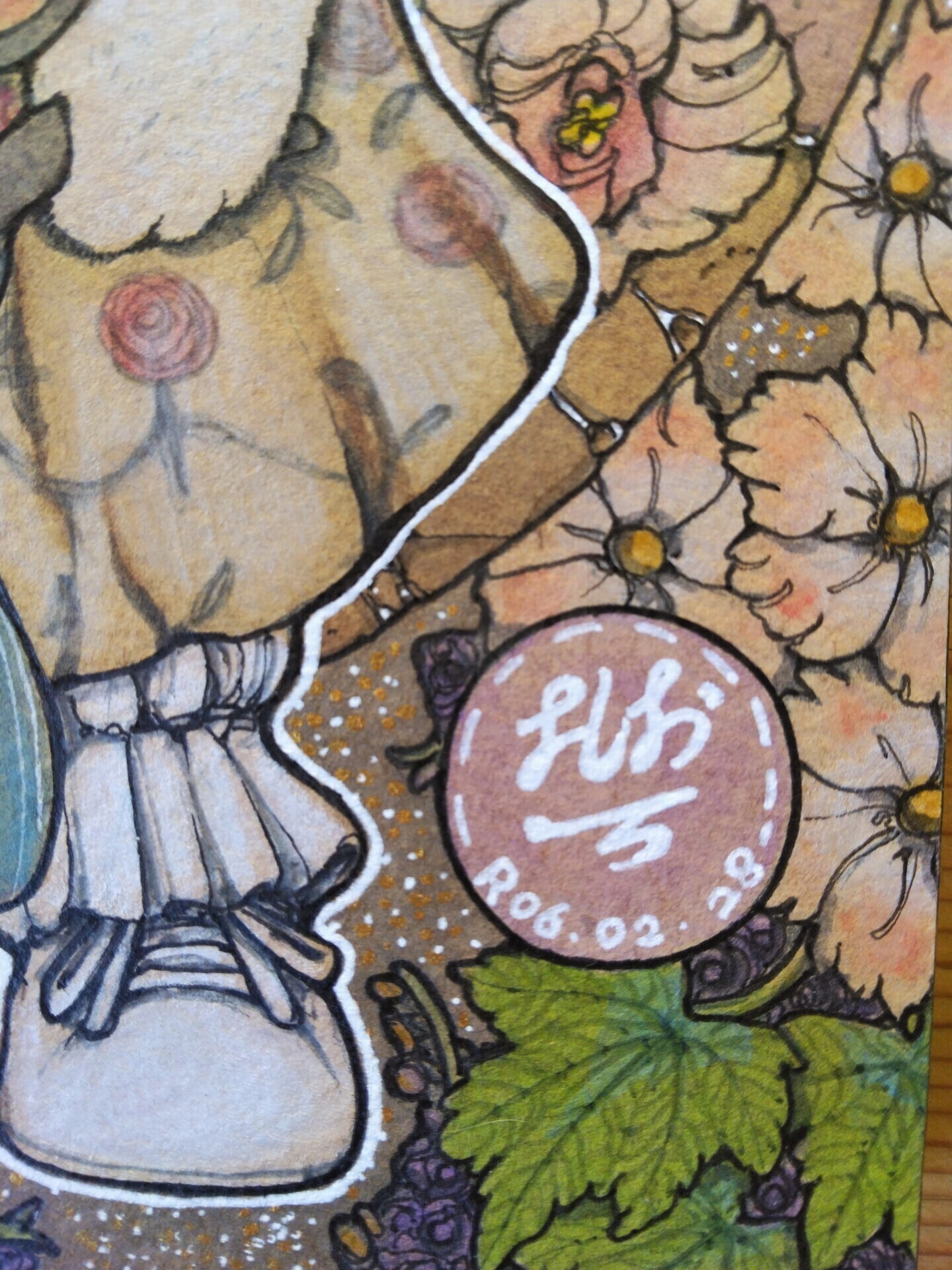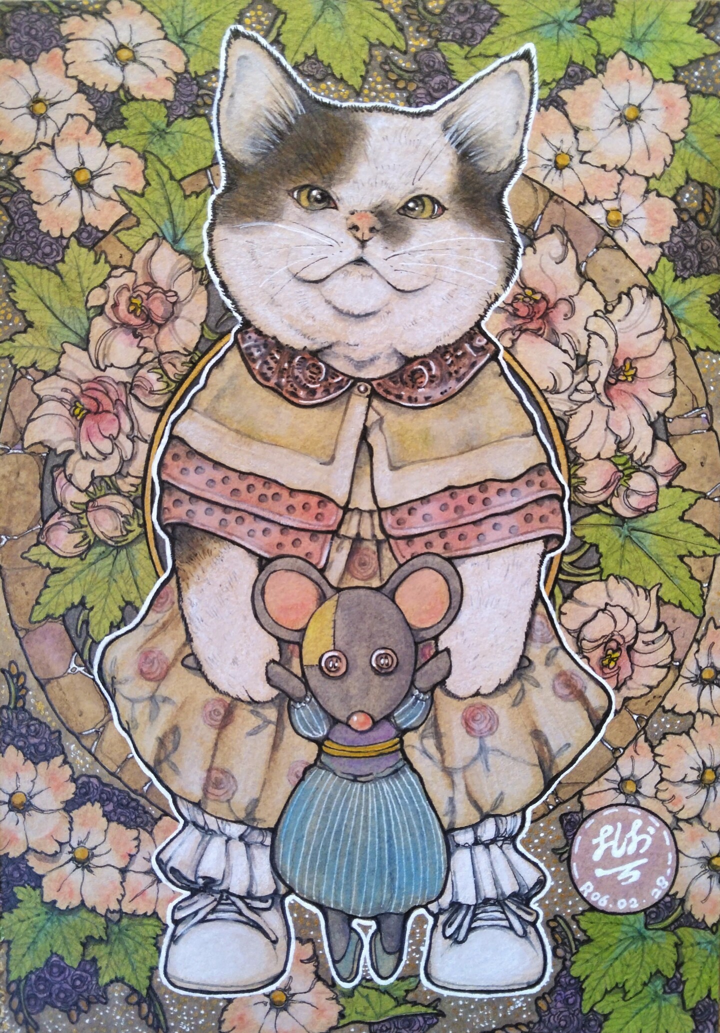 私の作品の着色方法は、まず製図用ペン(耐水性)で骨書きをしてから、薄く解いたアクリルガッシュで下塗りをします。この下塗りが重要で、何度も塗り重ねて狙った色合いになるようにしています。そのあと水彩色鉛筆や薄墨で仕上げをするのですが、場合に応じて水彩以外の画材も使用して、作品に強いアクセントを与えるような仕上げ方をしています。