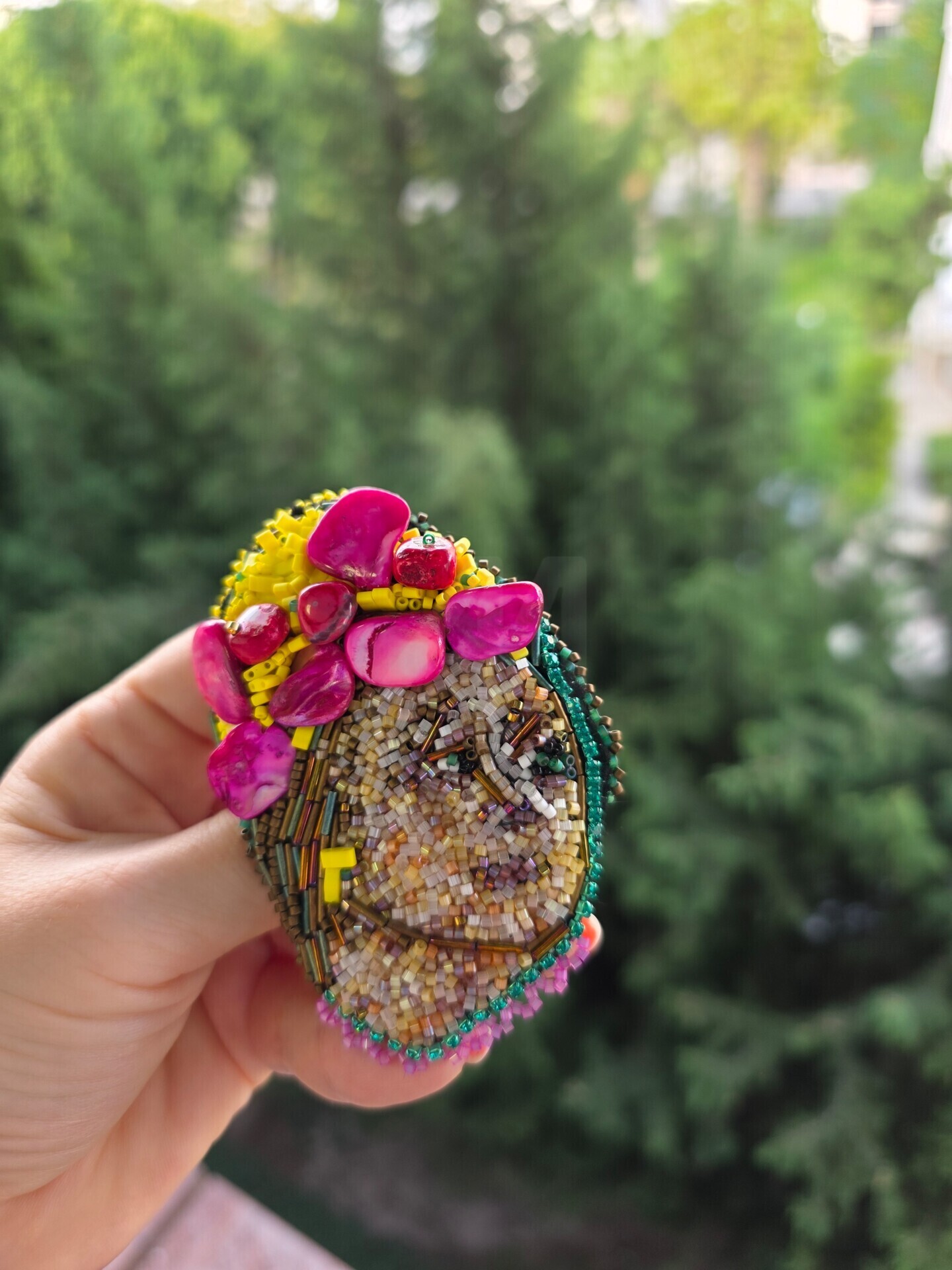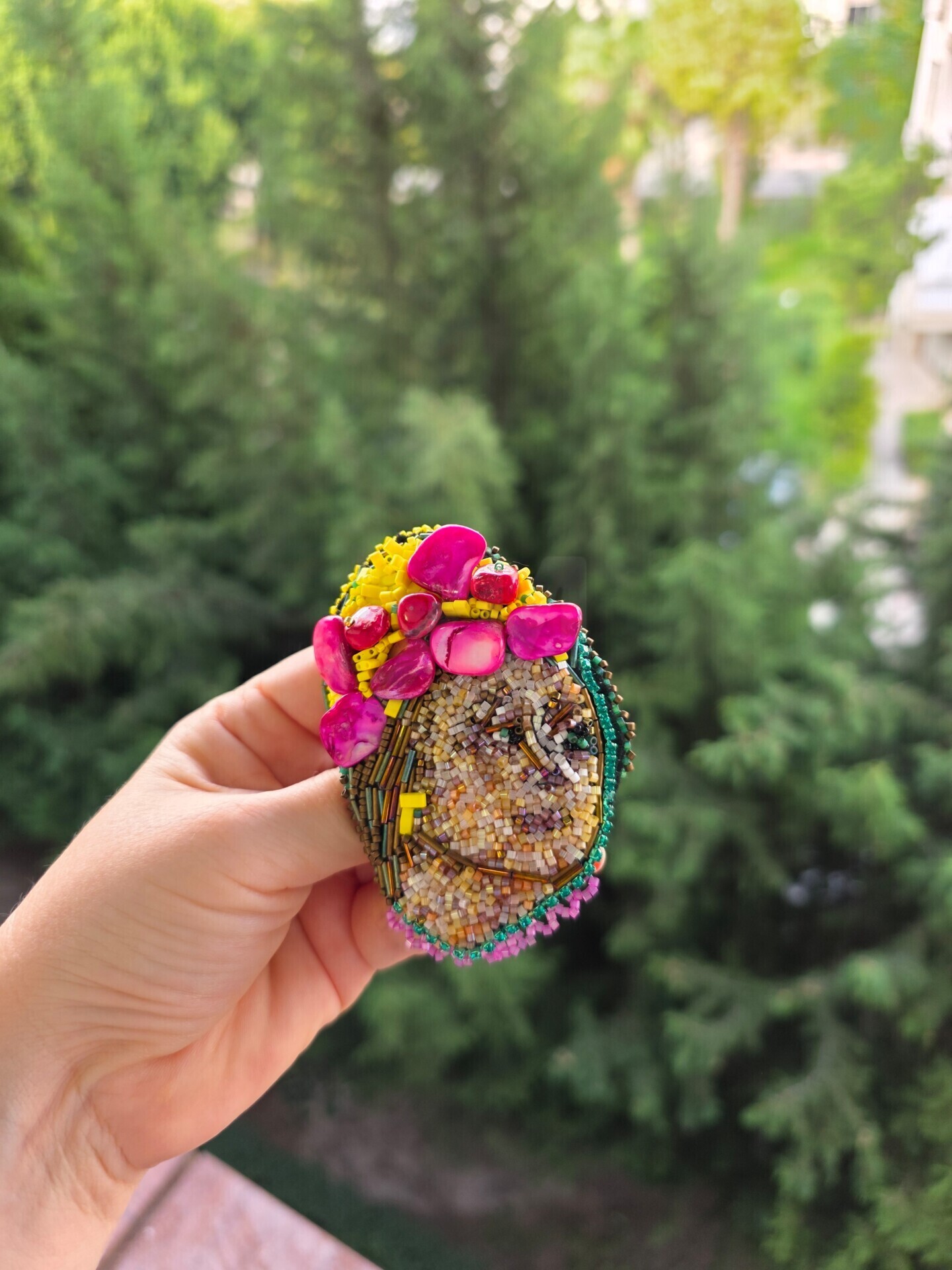 This is a gemstone portrait embroidered brooch "Happy Doll", transforming happiness, brightness and life. I used here pink pearl and gold plated beads 24K.